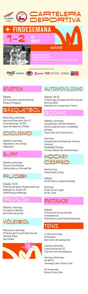 Cartelera deportiva del 1 al 2 de marzo Feb 28, 2025 Los mejores karatecas del país se citan en el Centro de Deportes de Contacto del Estadio Nacional.