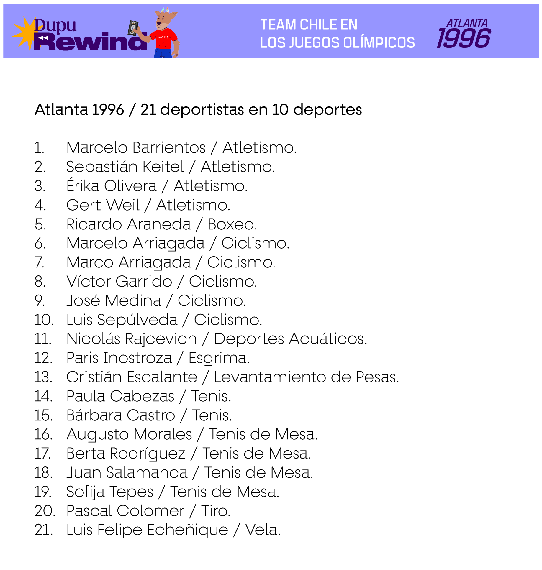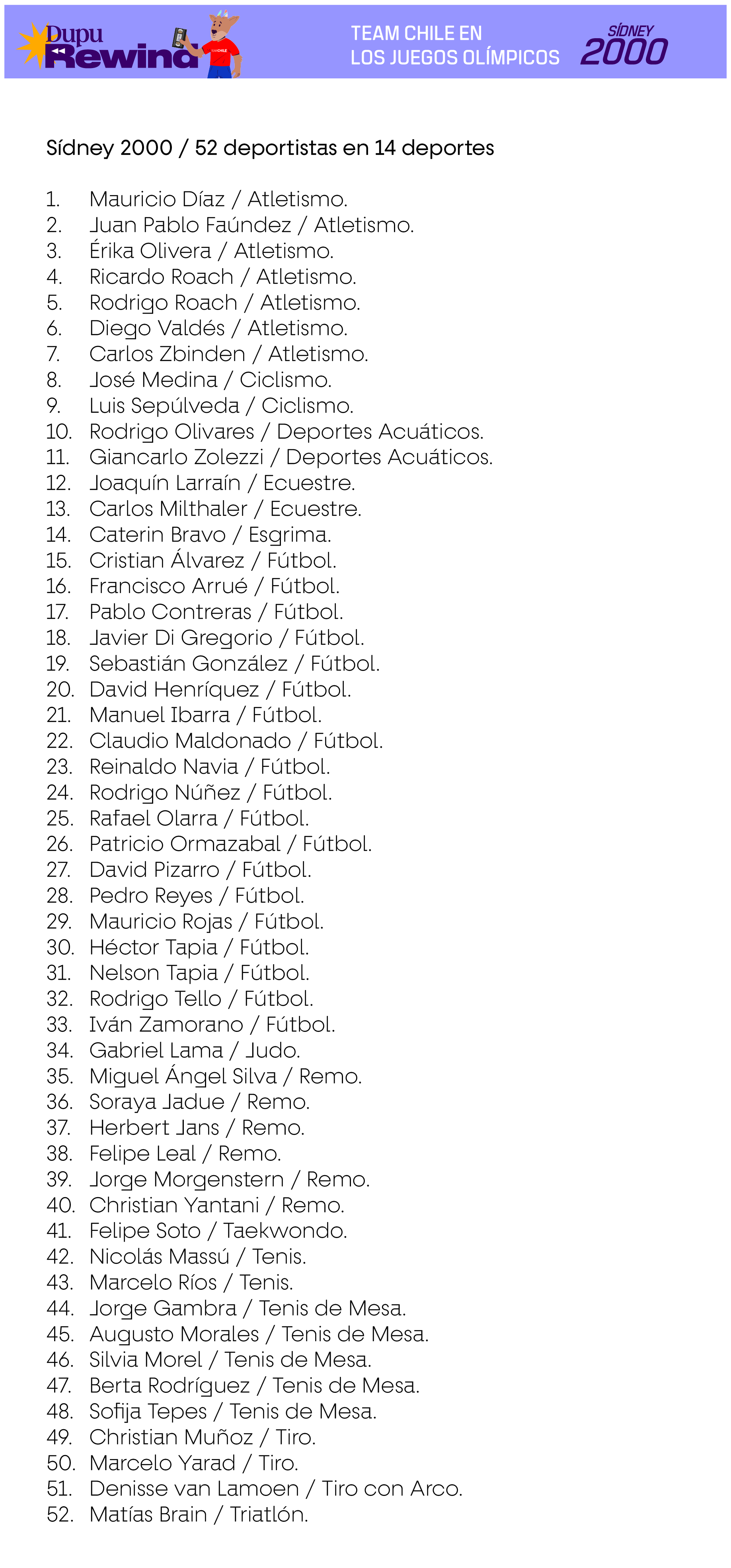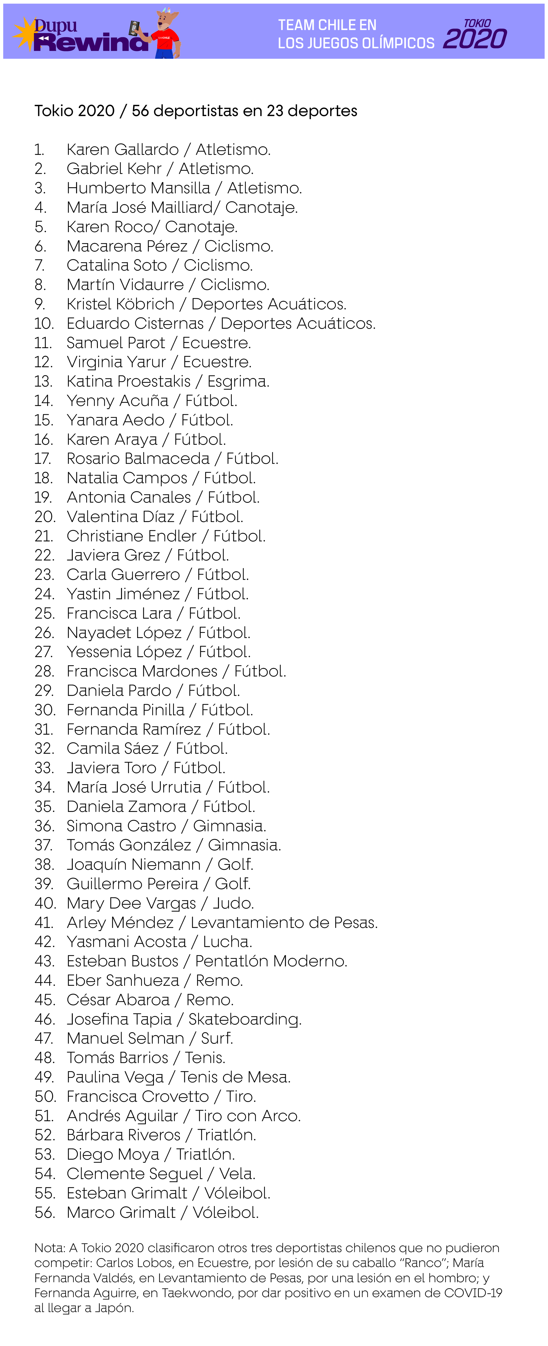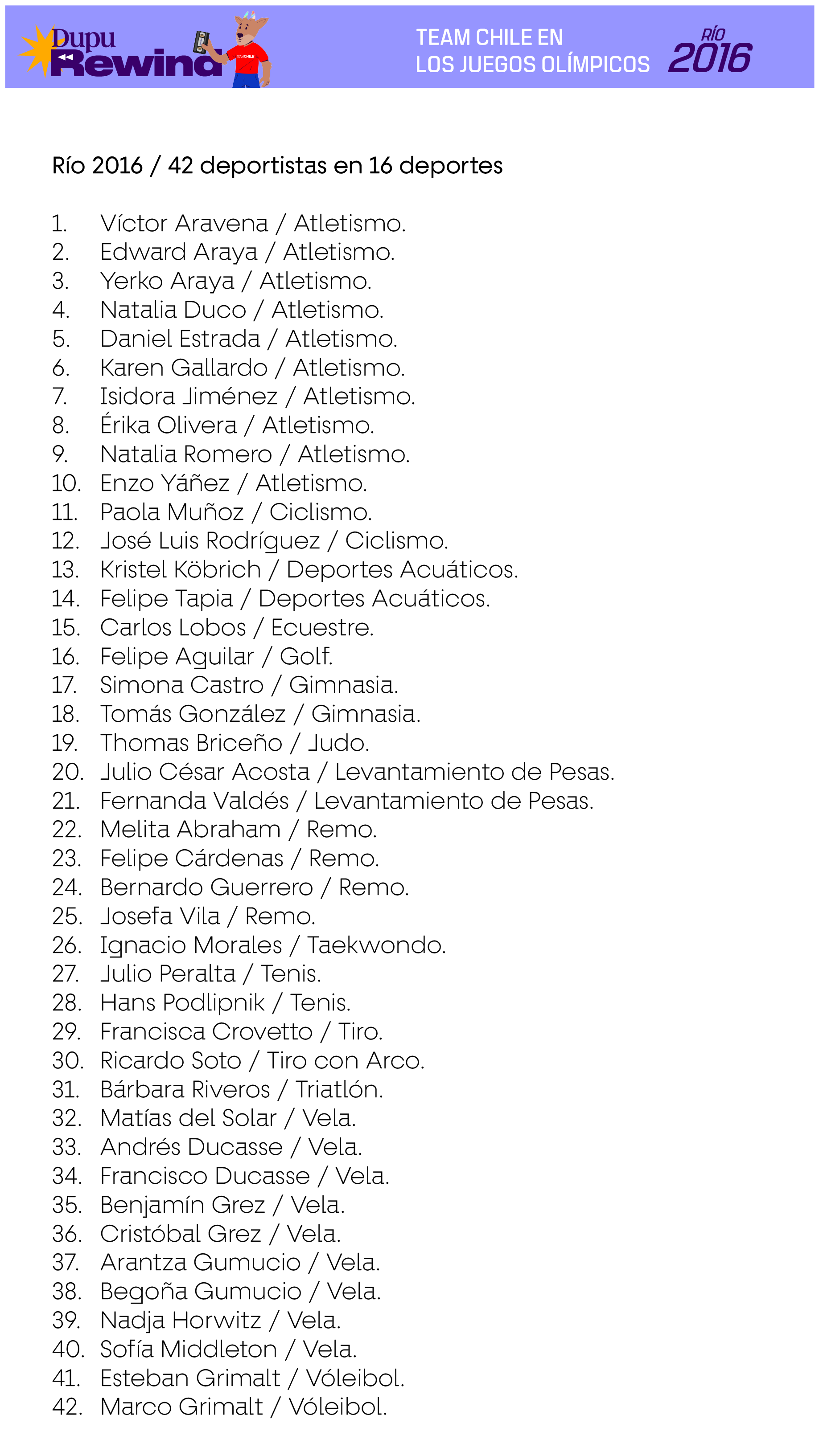 Las siguientes delegaciones consideran a deportistas que efectivamente compitieron en deportes oficiales del programa deportivo de cada Juego, en base a la información existente en Start Lists del Comité Olímpico Internacional, Informes Oficiales de cada Comité Organizador Local u otra evidencia de primera fuente. En el caso de los deportes colectivos, se consideran también a los suplentes que no hayan tenido minutos de juego siempre y cuando estén en los listados oficiales como habilitados para jugar en caso de haber sido requerido.